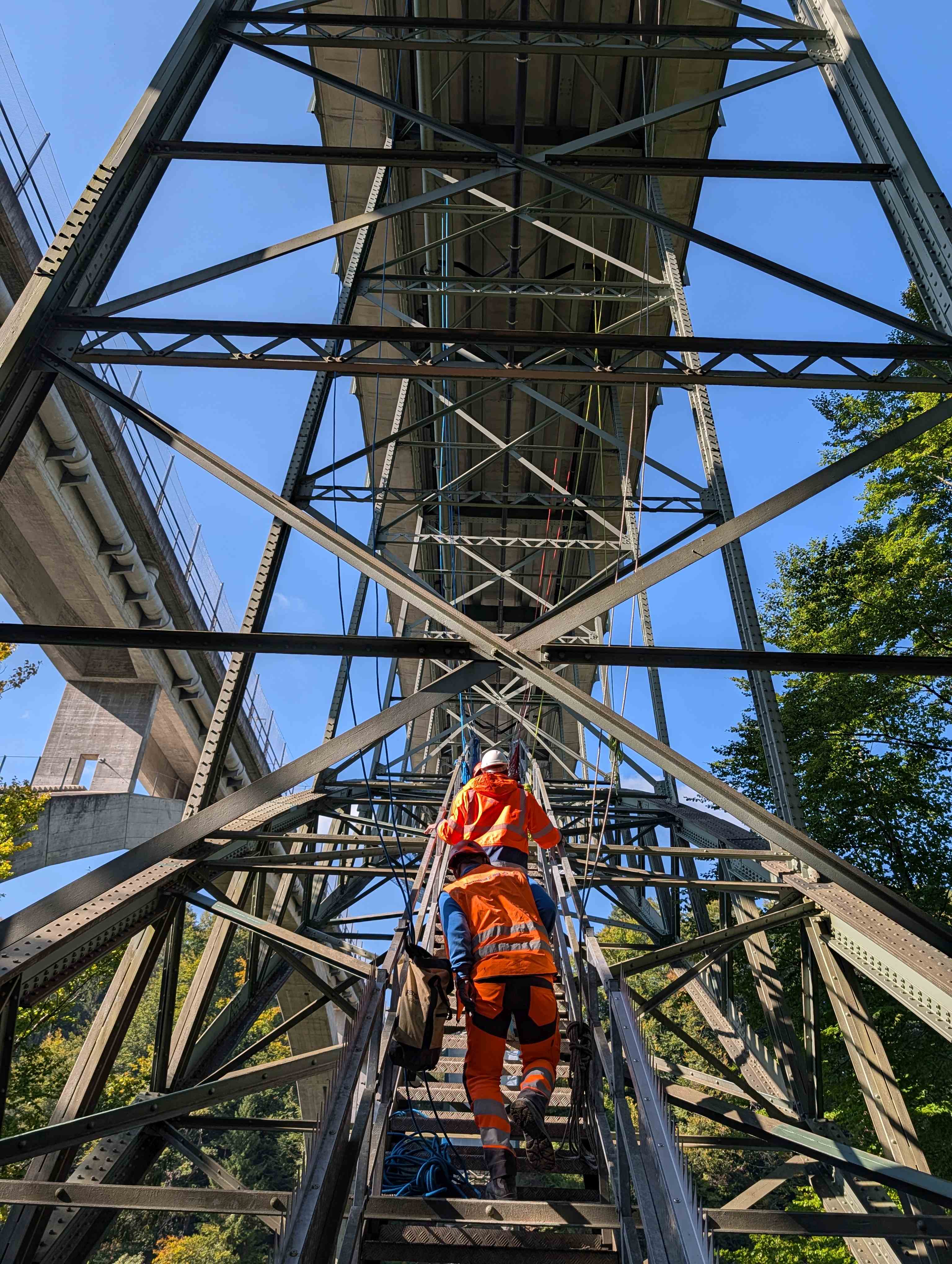 Unterhalb der Brückenenden wurde der Korrosionsschutz der Stahlkonstruktion und der Brückenlager vom eingehausten Gerüst aus vollständig saniert. Im Bereich des Brückenbogens wurden durch Industriekletterer am hängenden Seil lokale Korrosionsschutzsanierungen durchgeführt und die Dichtigkeit der Brückenentwässerungsleitungen wiederhergestellt. Das Natursteinmauerwerk der Widerlager und der Stützenfundamente wurde instandgesetzt.