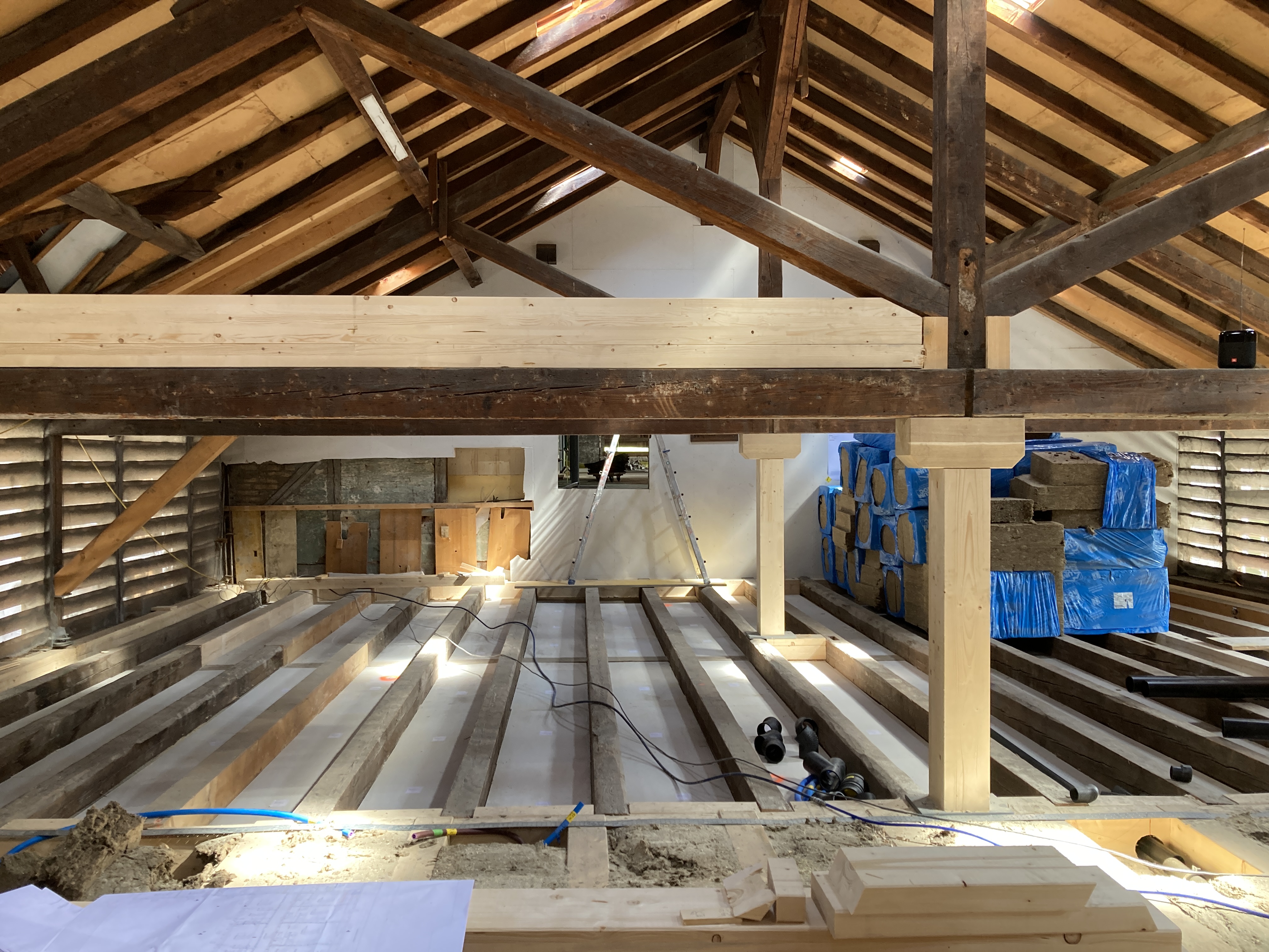 Wir verantworten die vollständige Tragwerksüberprüfung und -erhaltung der bestehenden Holztragwerke sowie die Planung sämtlicher Umbau-, Neubau- und Verstärkungsmassnahmen im Holz- und Massivbau. Auch die Erdbebenüberprüfung und die Ertüchtigungen nach aktuellen Normen waren Teil unseres Mandats. Über alle Projektphasen hinweg begleiteten wir das Bauvorhaben. Die grösste Herausforderung: die historische Bausubstanz bestmöglich zu erhalten und gleichzeitig die Stabilität während anspruchsvoller Bauzustände sicherzustellen.