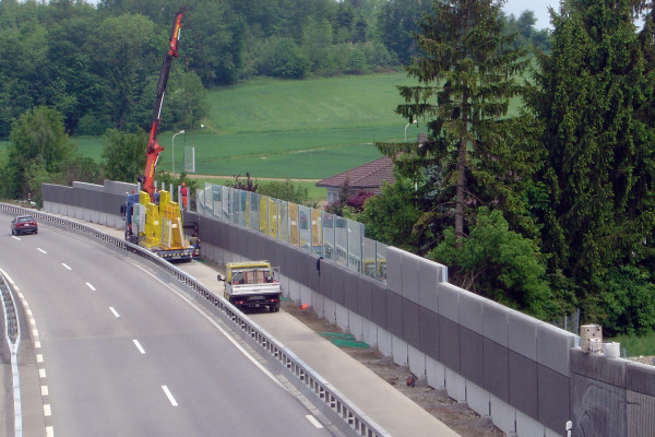 Das nun ausgeführte Projekt wurde in einem ersten Schritt durch eine Machbarkeitsstudie mit Kostenvergleichen, unter Beizug eines Lärmspezialisten, evaluiert. Die bestehende Polykletwand wie auch sämtliche Stützen wurden sorgfältig ausgebaut und fachgemäss entsorgt. Im Bereich der Erhöhung mussten die bestehenden Pfahlfundationen durch Fundamentverbreiterungen verstärkt werden. Der neue Lärmschutz besteht aus Sockel- (200m2) und Betonrippenplatten (340m2) sowie Glaselementen (180m2). Dabei wurde die rückseitige Farbgebung der Betonrippenplatten den Wünschen der Anwohnerschaft angepasst. Nebst der statischen, konstruktiven und baubegleitenden Bearbeitung des Projektes erfolgten durch uns auch sämtliche logistischen Planungen und Koordinationen mit dem Strasseneigentümer, Anwohnern und Gartenbauunternehmern.