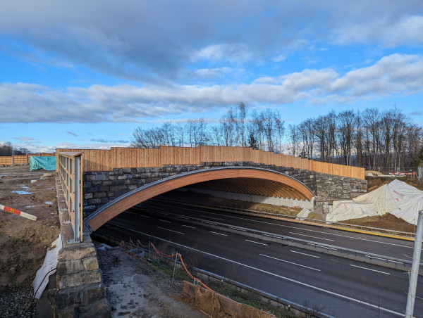 Die Erstellung der Wildtierquerung erfolgte unter laufendem Betrieb der Nationalstrasse mit mehrfacher Umstellung der Verkehrsführung. Insbesondere das Einheben der Holzbogenträger mit provisorischer Mittelabstützung unter dem Scheitelstoss erforderte eine detaillierte Vorbereitung und Ablaufplanung. Die Halbträger wurden just-in-time geliefert und eingehoben. Das millimetergenaue Versetzen wurde laufend geodätisch überwacht, damit die passgenaue Verbindung im Bogenscheitel mit den zweiten Halbträgern sichergestellt werden konnte. Auch das vorgängige Versetzen der Stahleinlagen in den beiden Widerlagerwänden erforderte eine hohe Masshaltigkeit im Millimeterbereich. Die Erstellung der Betonschale und der Überdeckung musste mit einer begrenzten asymmetrischen Belastung erfolgen. Dazu wurde ein präzises Bauphasenprogramm erstellt und laufend kontrolliert.